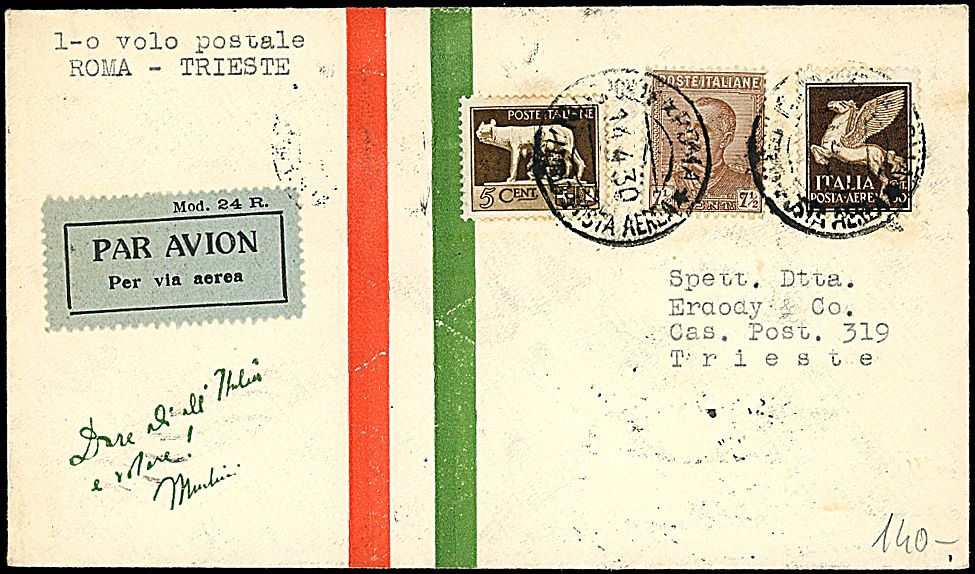 1930 - ROMA - VENEZIA - TRIESTE - Aerogramma da Roma (14/4/30) a Trieste, via Veneiza - Bollo di arrivo (Longhi 2118a)