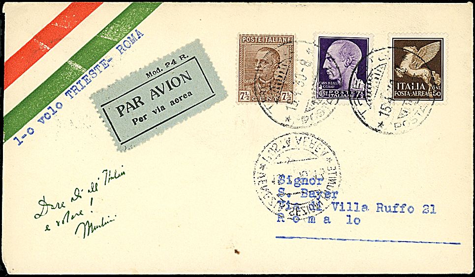 1930 - TRIESTE - VENEZIA - ROMA - Aerogramma da Trieste (15/4/30) a Roma - Bollo di arrivo - Rara, 15 trasportati (Longhi 2122a)