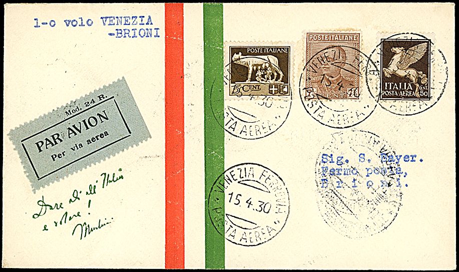1930 - Volo Roma - Venezia - Broni - Aerogramma da Venezia (15/4/30) a Brioni - Bollo di arrivo - Dispaccio 15 buste (Longhi 2127b)