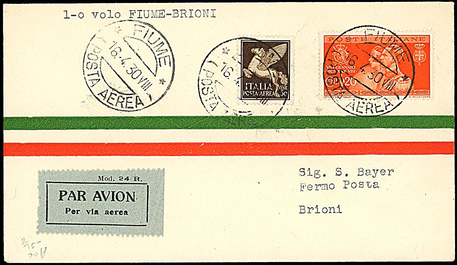 1930 - FIUME - BRIONI - Aerogramma da Fiume (16/4/30) a Brioni - Bollo di arrivo - Dispaccio 20 buste (Longhi 2133)