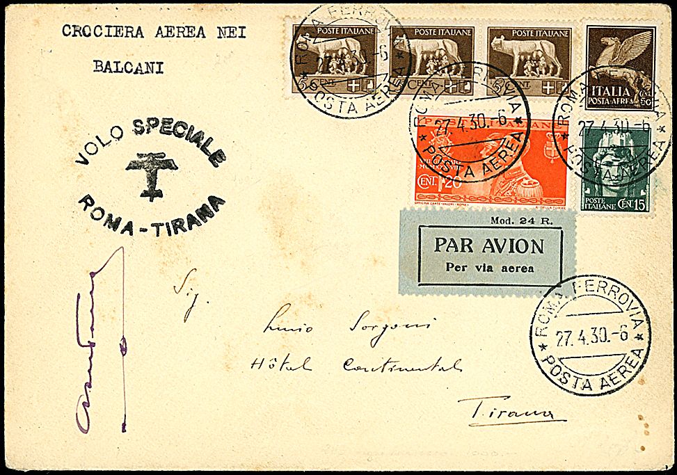 1930 - Roma - Tirana / Volo speciale - Aerogramma da Roma (27/4/30) a Tirana - Bollo di arrivo - Dispaccio 81 buste e firma autografa del pilota (Longhi 2144)
