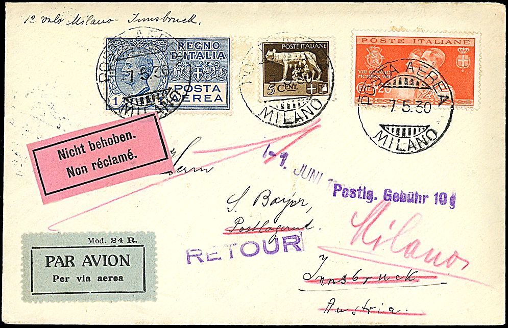 1930 - Volo Milano - Insbruck - Aerogramma da Milano (7/5/30) ad Insbruck - Bollo di arrivo (Longhi 2152b)