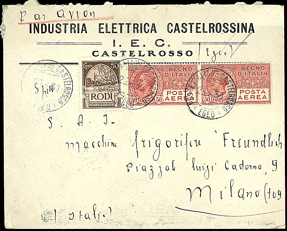 1930 - Aerogramma da Castelrosso (26/6/30) a Milano con affrancatura mista Egeo - Italia - Bollo di arrivo