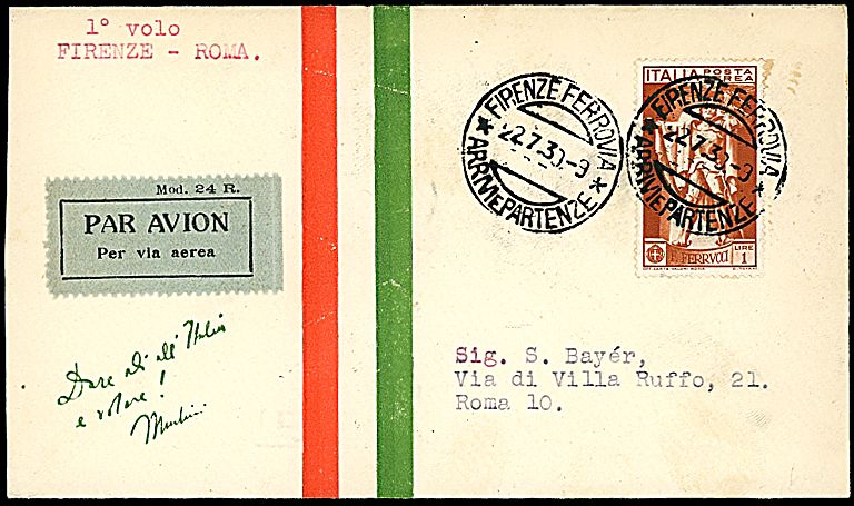 1930 - Firenze - Roma - Aerogramma da Firenze (22/7/30) a Roma - Bollo di arrivo - 20 buste trasportate (Longhi 2197)