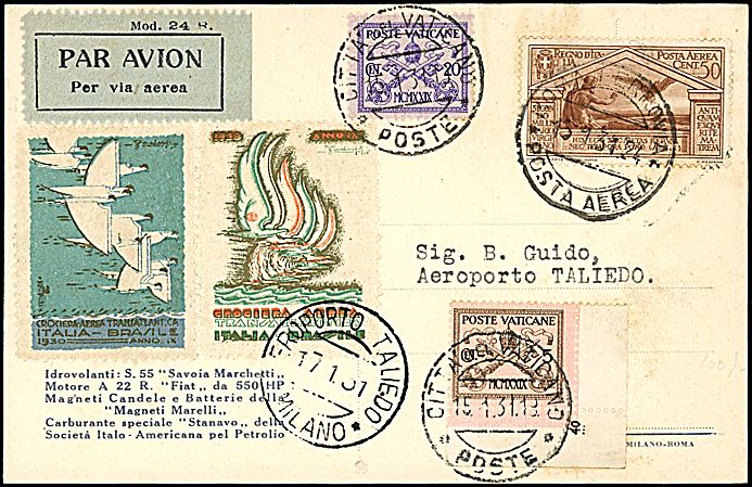 1931 - VATICA - ROMA - TALIEDO - Cartolina ufficiale della Crociera dalla Cittā del Vaticano (15/1/31) a Taliedo - Bollo di arrivo - 58 cartoline trasportae (Longhi 2307)