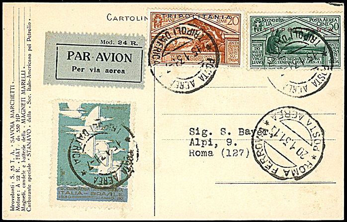 1931 - TRIPOLI - ROMA - Cartolina della Crociera Atlantica con etichette commemorative da Tripoli (15/1/31) a Roma - Bollo di arrivo (Longhi 2308a)