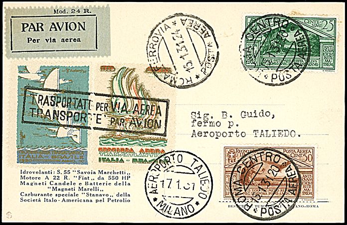 1931 - ROMA - TALIEDO - Cartolina della Crociera Atlantica con etichette commemorative da Roma (15/1/31) a Taliedo - Bollo di arrivo (Longhi 2308aa)