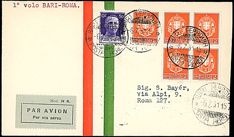 1931 - BARI - ROMA - Aerogramma da Bari (6/7/31) Roma - Bollo di arrivo - Rara, 42 buste trasportate (Longhi 2438)