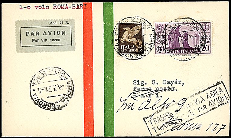 1931 - ROMA - BARI - Aerogramma da Roma (6/7/31) a Bari - Bollo di arrivo - 20 buste trasportate (Longhi 2425)