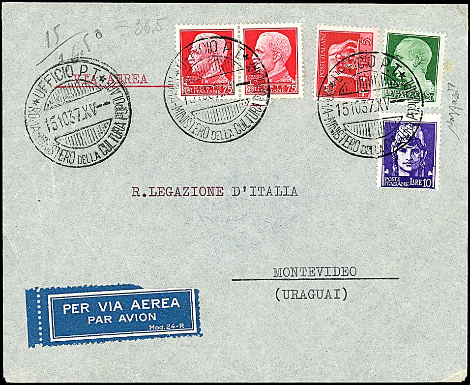 1937 - Aerogramma con affrancatura quadricolore da Roma (15/10/37) a Montevideo, trasportata da Marsiglia a destino con Air France Volo 117 - Bollo di arrivo - Non comune - Cert. Caffaz