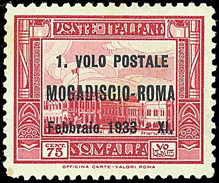1933 - Roma - Mogadiscio / Tentativo di collegamento rapido - Francobolli di Somalia soprastampati 1. Volo postale / Mogadiscio - Roma / febbraio 1933 - XI - Tre esemplari con bollo di controllo blu al verso - Rari!