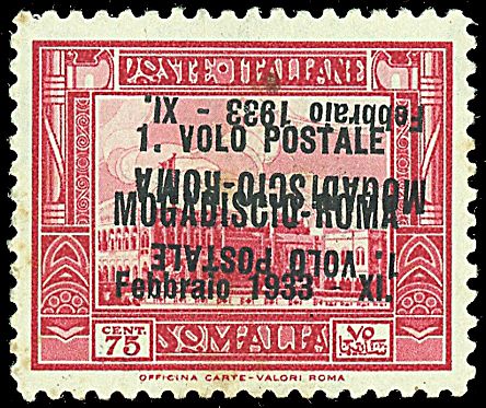 1933 - Roma - Mogadiscio / Tentativo di collegamento rapido - Francobolli di Somalia soprastampati 1. Volo postale / Mogadiscio - Roma / febbraio 1933 - XI - 75 c. carminio con doppia soprastampa di cui una capovolta e con bollo di controllo blu al verso - Rari!